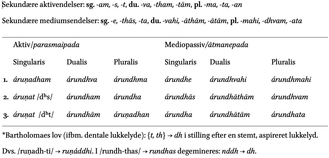 Særlige imperativendelser i 1 sg: akt. -dhi, med. -sva. De øvrige endelser er de sekundære, men 3sg. og pl. har fået et suffiks: Aktiv: -u (s. -t-u, pl. -nt-u), medium: -am (sg. -ta-am, pl. -ata-am).